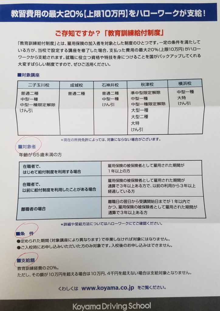 コヤマドライビングスクールで教育訓練給付金制度を利用する場合
